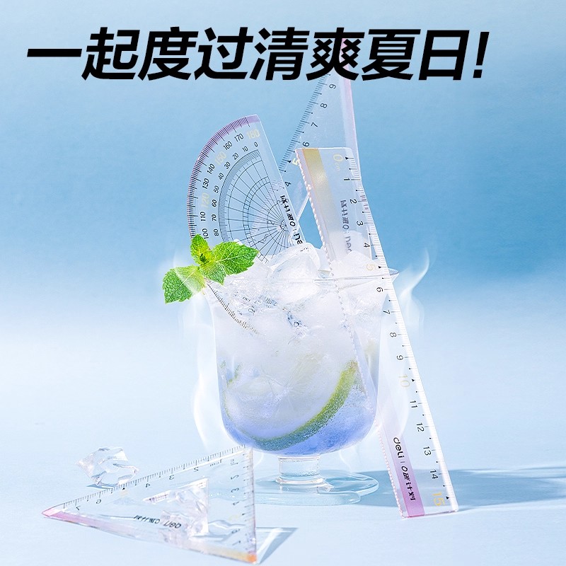 得力碳中和环保系列套尺学生用四件套测量绘图透明15cm直尺三角尺量角器几何工具塑料直尺学生文具绘图尺