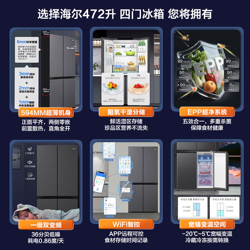 政府换新补贴海尔476L双开四门一级超薄风冷无霜家用大容量电冰箱
