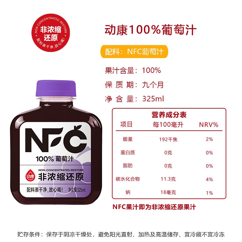 动康NFC果汁饮料非浓缩100%葡萄汁苹果汁橙汁鲜榨混合杨梅饮品