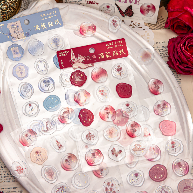 以玫瑰之名烫金浮雕立体滴胶玫瑰贴纸ins复古透明仿火漆印章信封信纸贺卡封口贴手帐素材DIY礼物包装装饰贴画