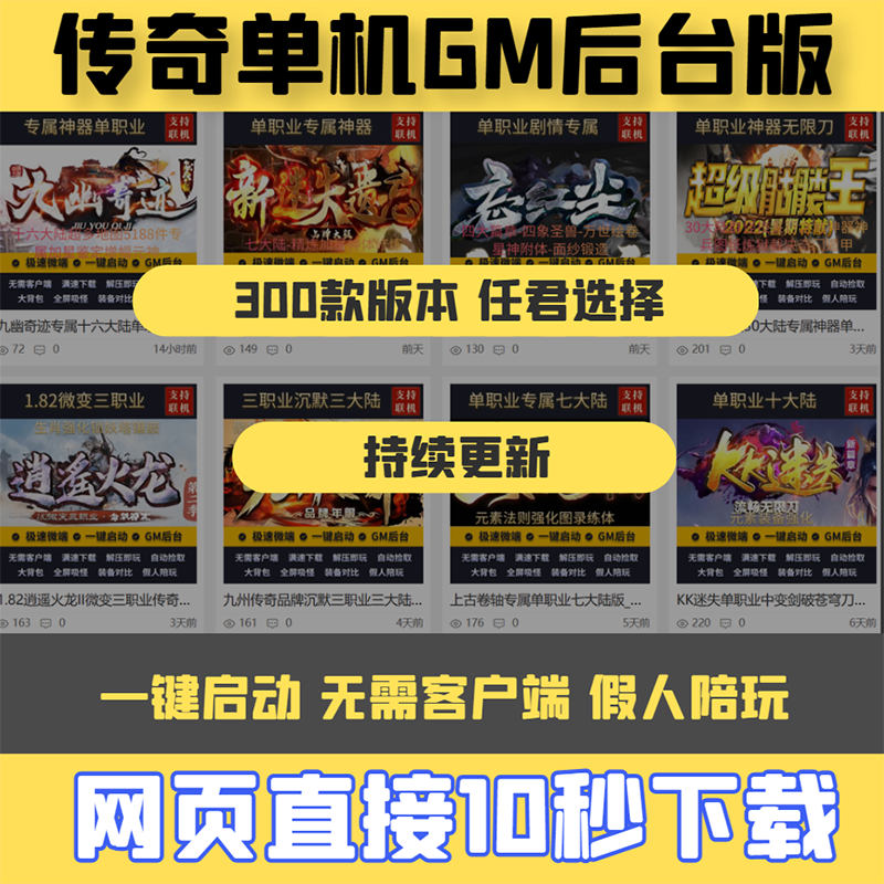 传奇单机版几百款游戏任意选择假人陪玩极速微端GM后台持续更新