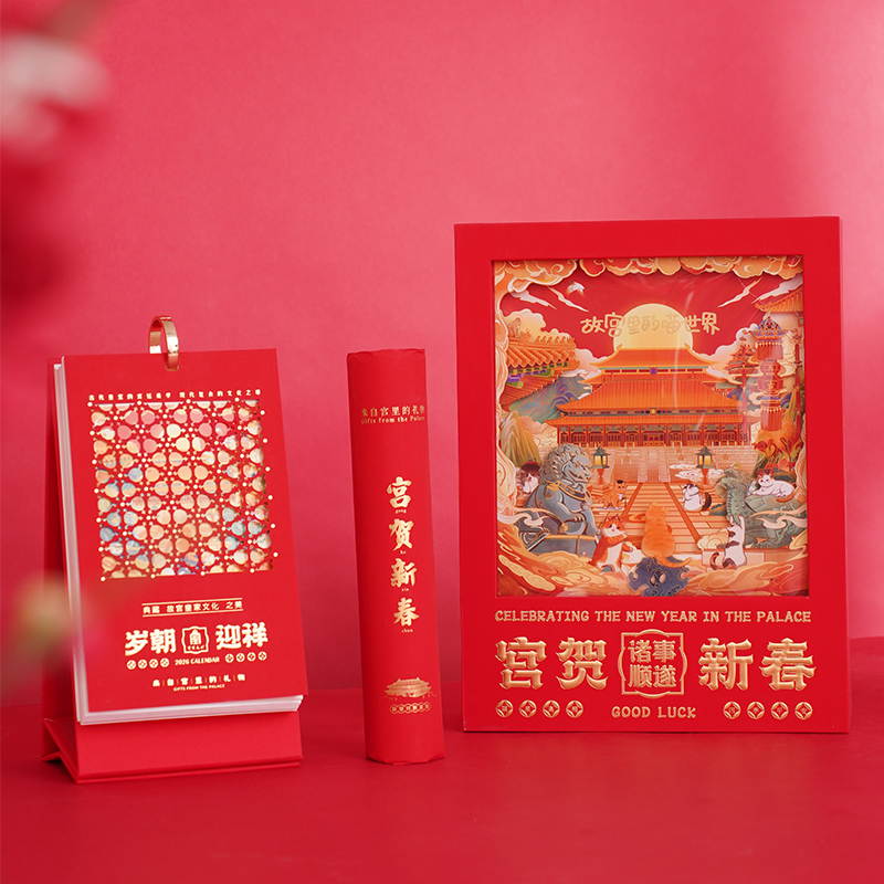 2026年周历采用故宫花窗【三交六椀菱花】题材设计封面推出横竖版两款台历带阴历香港日历且曾配对联红包套装