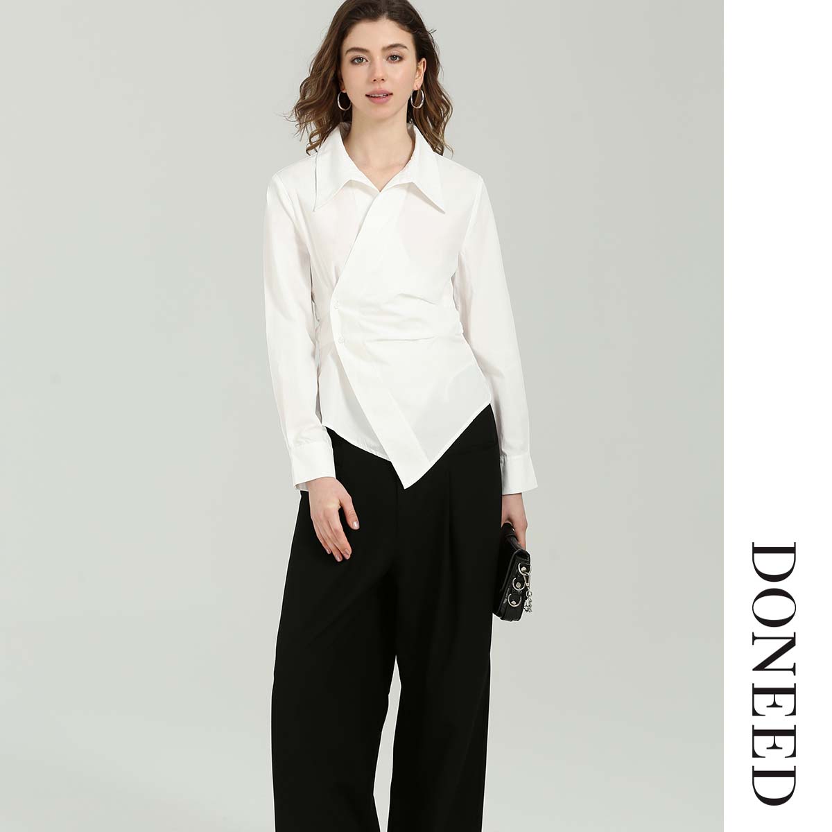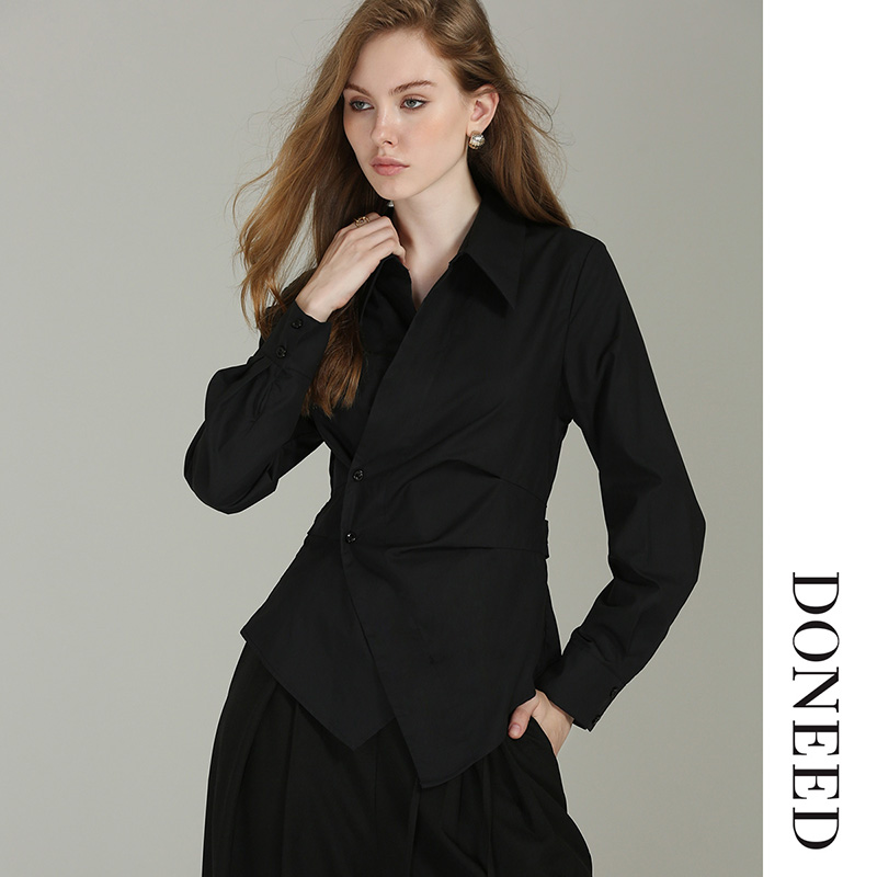 DONEED春款新中式交叉收腰翻领纯色优雅显瘦不规则下摆上衣衬衫女