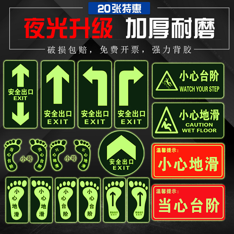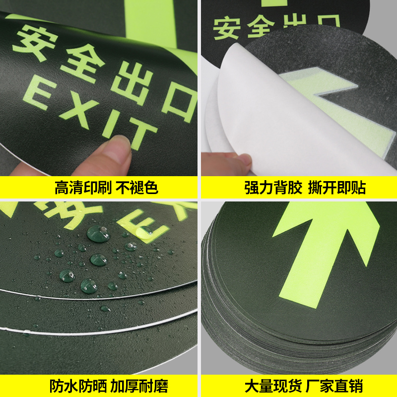 夜光紧急通道楼梯地面提示牌圆形疏散逃生箭头标小心台阶地滑标志直行箭头安全出口标识指示牌自发光荧光地贴