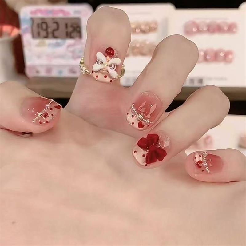 醒狮穿戴甲蛇年美甲饰品2025新年爱心款红色系可爱蝴蝶结立体短款