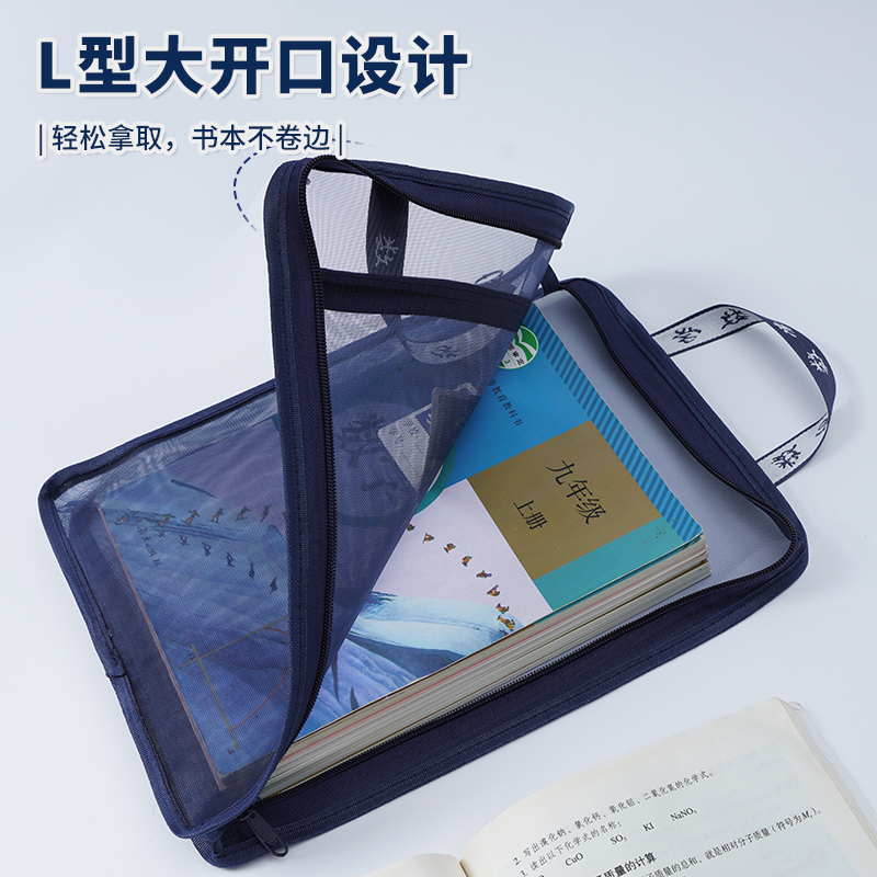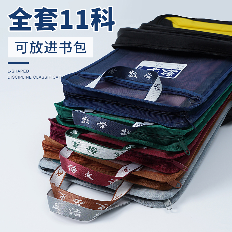 11科复古风L型科目分类袋手提透明网纱拉链式大开口拎书袋考试专用袋初中生小学生作业补习袋试卷收纳文件袋