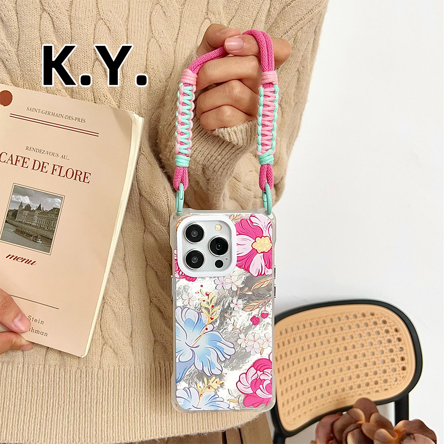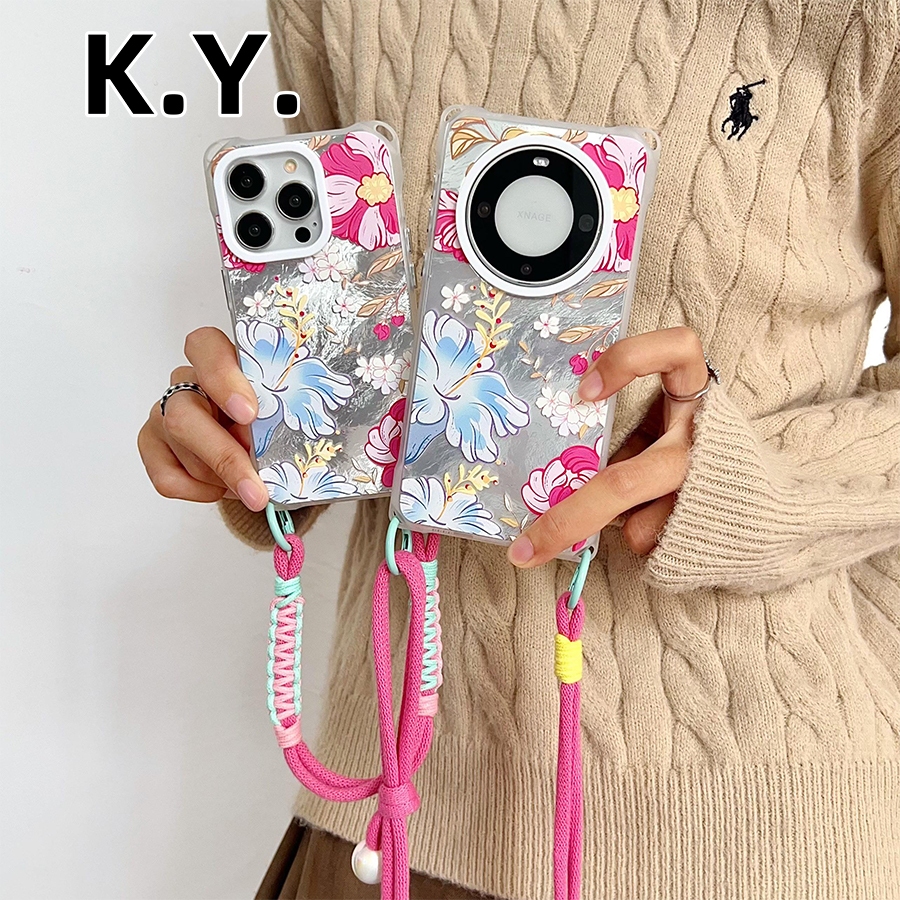 ins粉蓝绘画花冰川纹手机壳带挂绳适用苹果16promax华为MATE70PRO四角开孔VIVOX200手提斜挎OPPOfindX8保护套