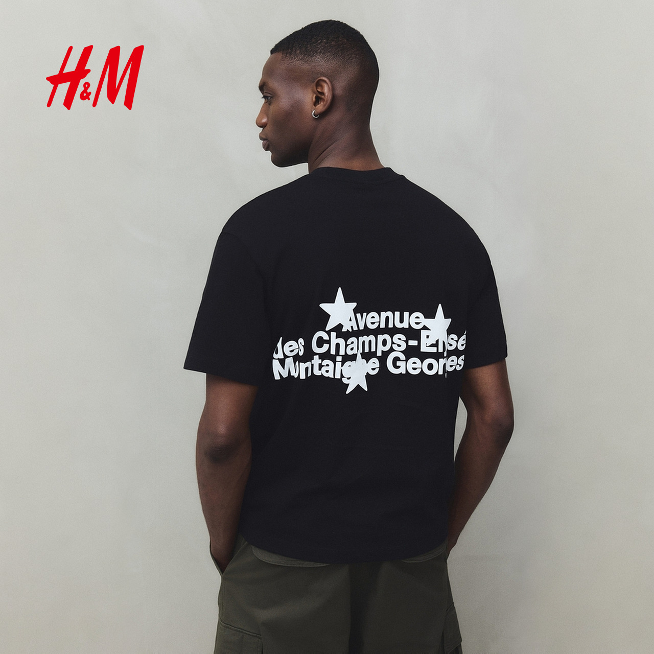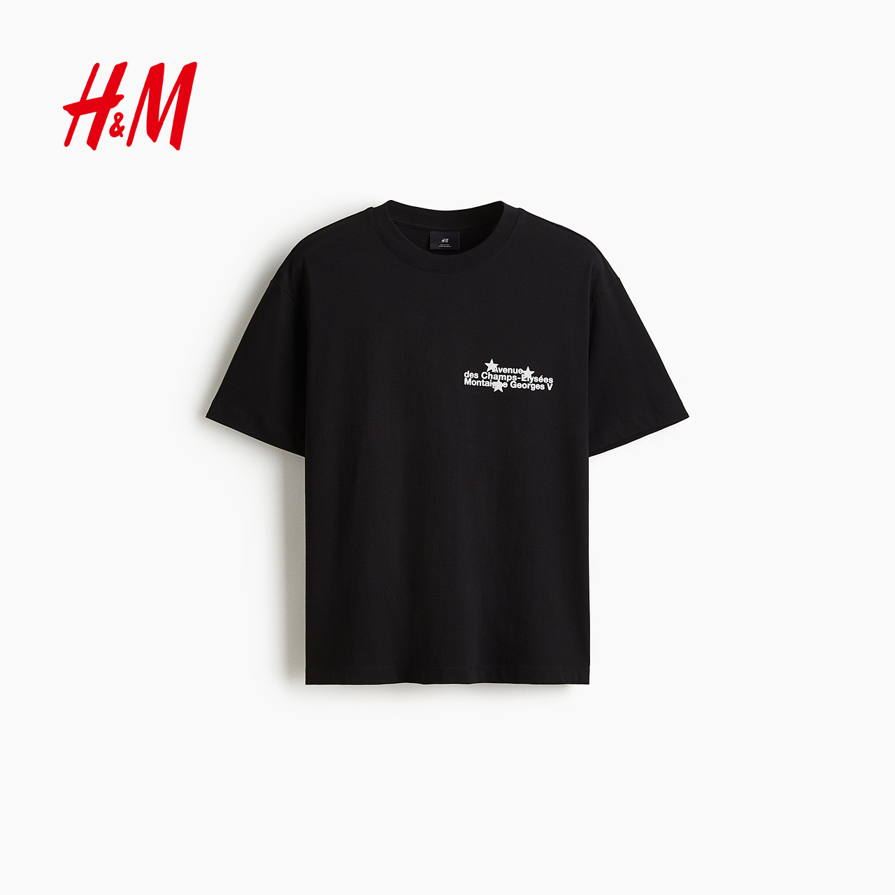 HM男装T恤2024夏季新款印花棉质中等克重落肩宽松短袖上衣1227157