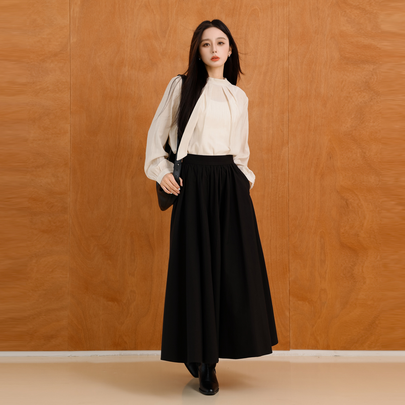 AIRIQI秋季新款休闲宽松简约小立领压褶飘带设计感衬衫AH43XS440