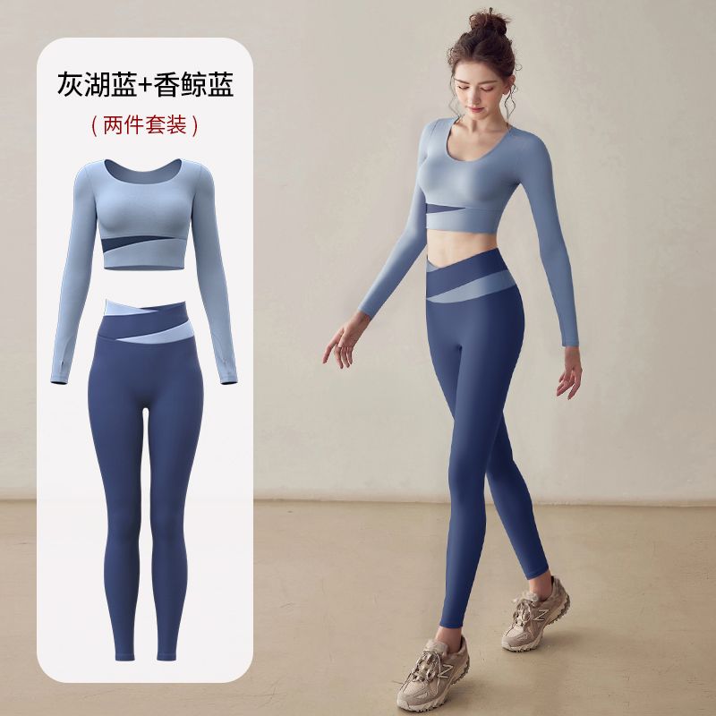 瑜伽服女套装秋冬新款显瘦紧身健身运动跑步长袖普拉提带胸垫上衣