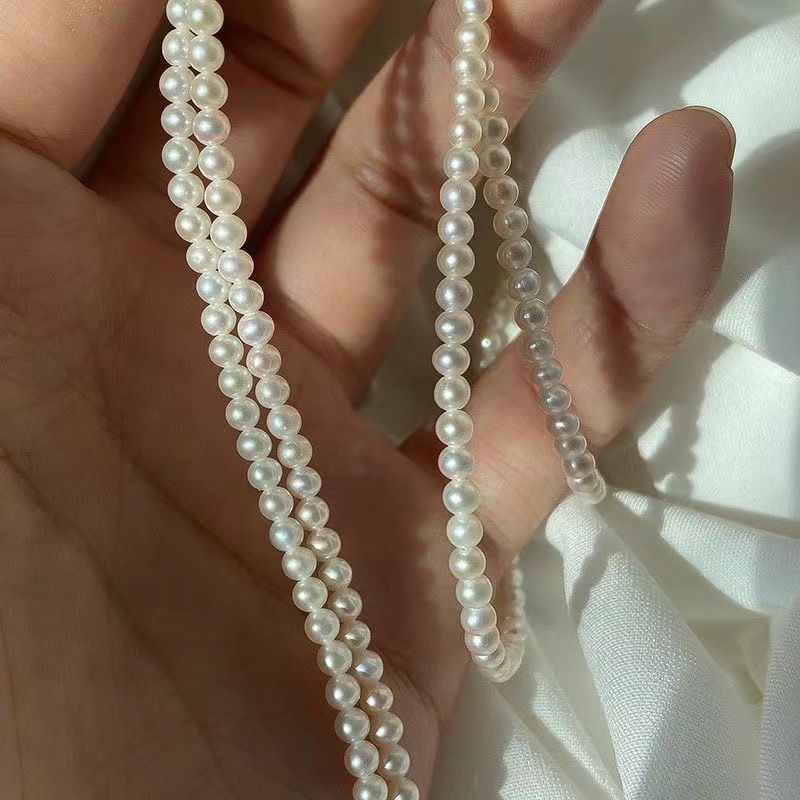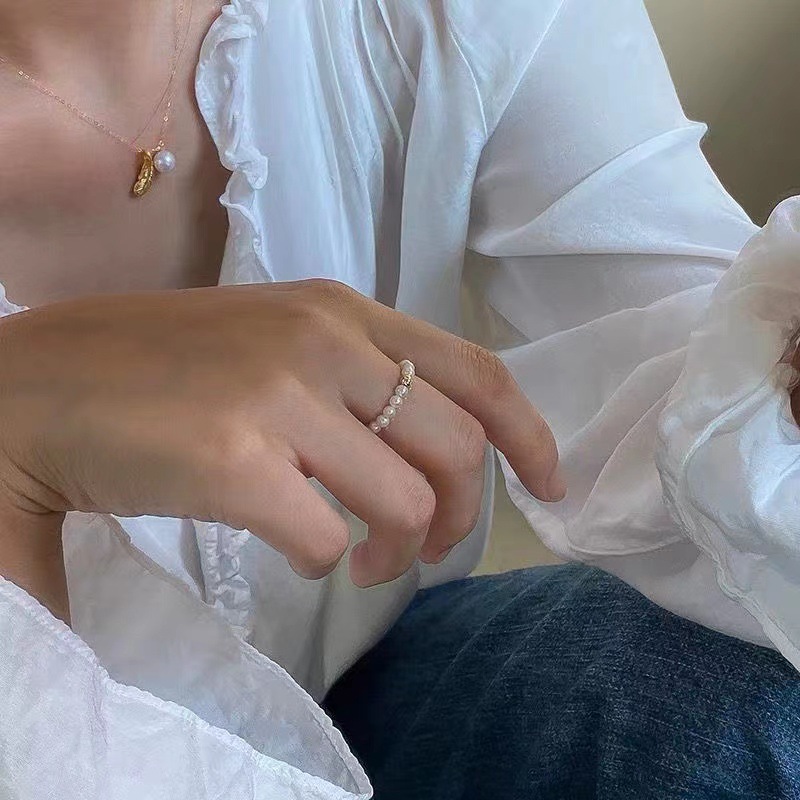 天然淡水弹力珍珠戒指女近圆珠强光小金珠戒指镀金小球戒圈指环