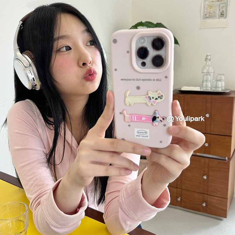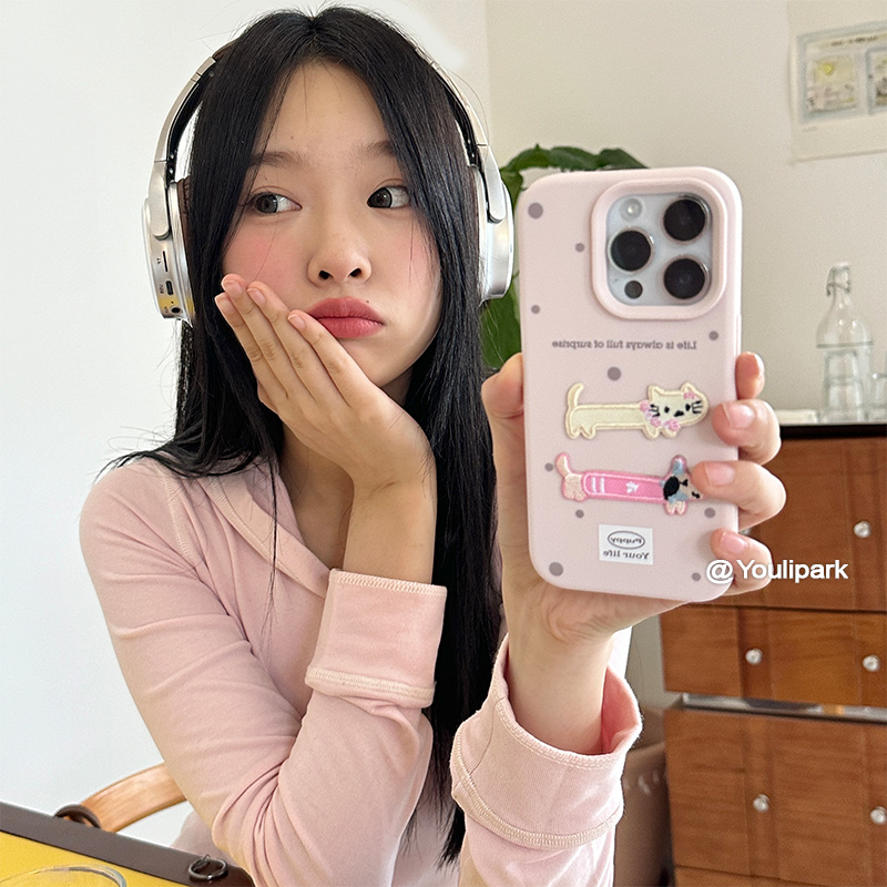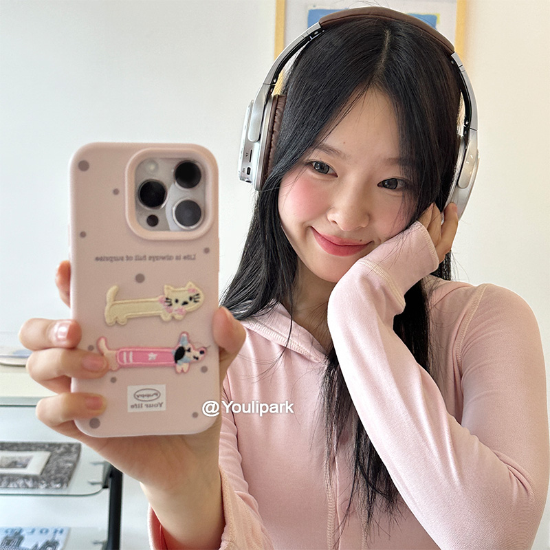 由里公园ins可爱少女奶油粉刺绣猫咪小狗适用17pro苹果17ProMax手机壳iPhone16全包17新款14Promax保护套15软