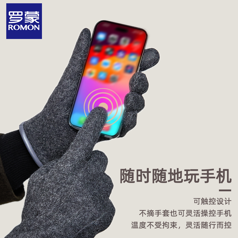罗蒙羊毛手套男士冬季保暖加厚手套加绒骑行可触屏户外防寒手套ND