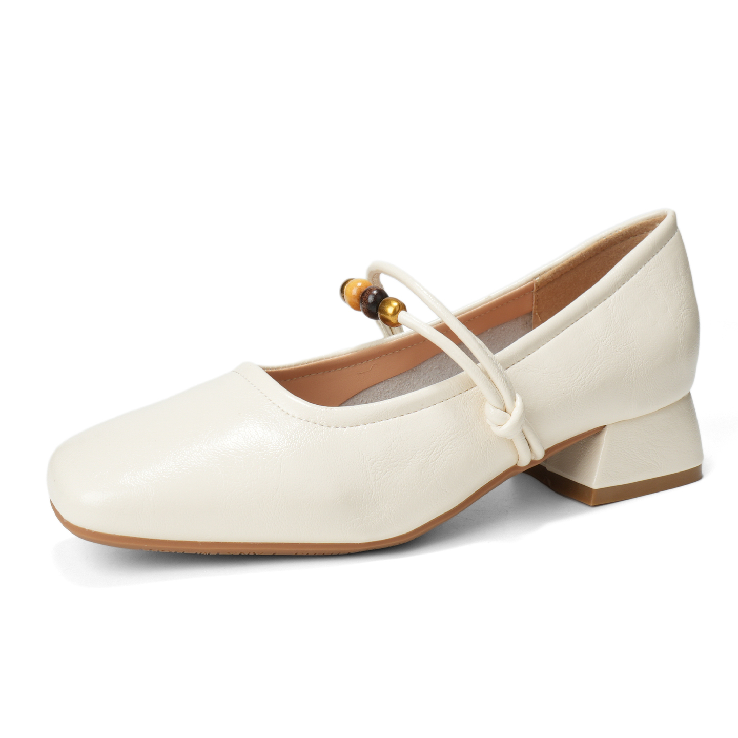 六点大叔真皮粗跟单鞋女2025春季新款珍珠伴娘白色高跟鞋玛丽珍鞋