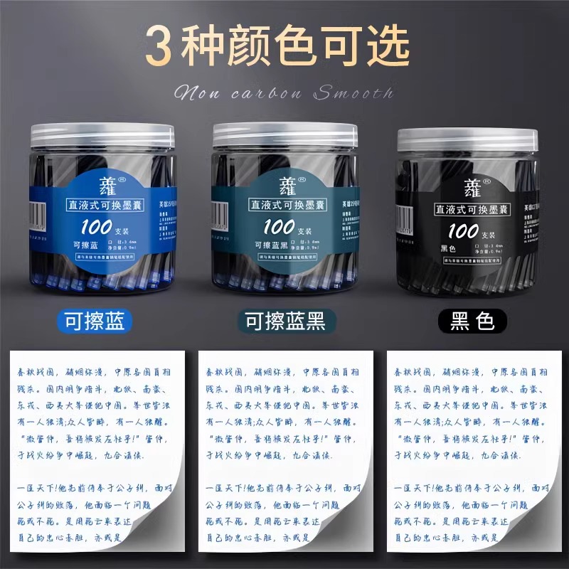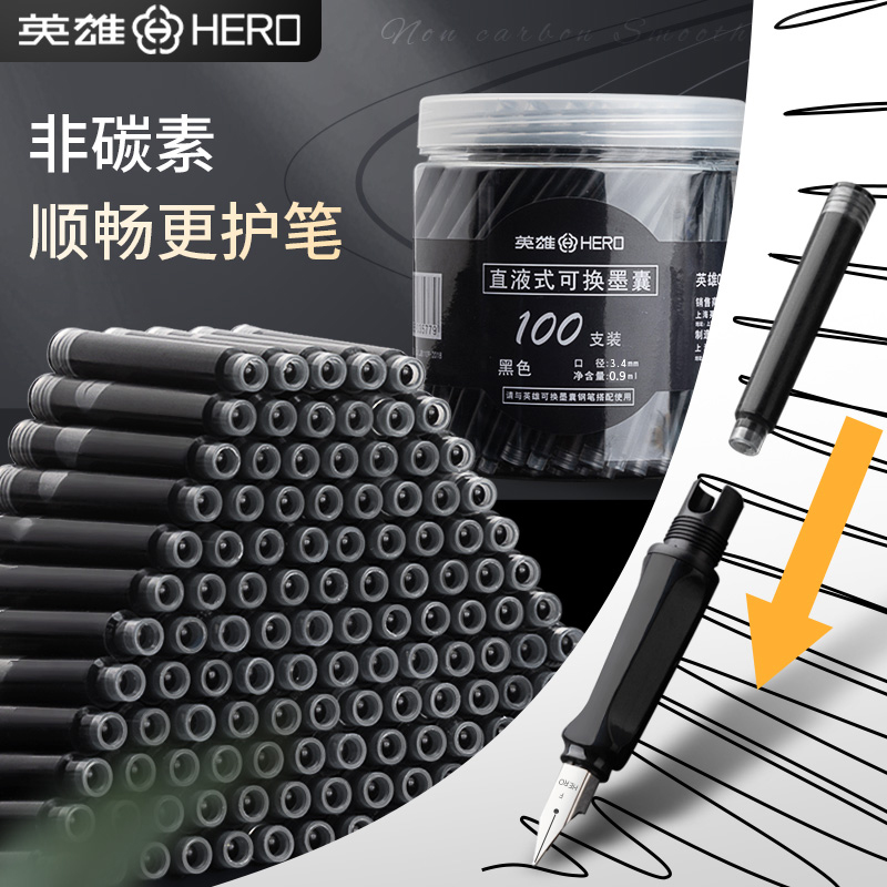 英雄牌墨囊100支桶装中学生专用钢笔墨囊可替换通用3.4mm小学生三年级用2.6小口径练字用墨水胆纯蓝蓝黑色