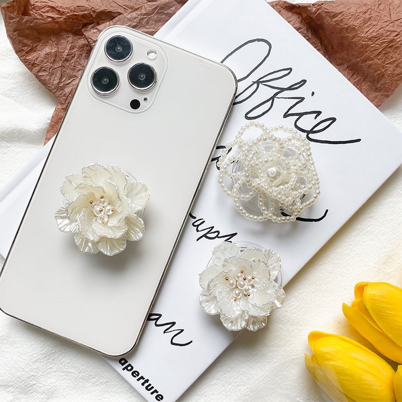 创意珍珠花朵山茶花镶水钻高级透明手机气囊支架伸缩可折叠背贴女