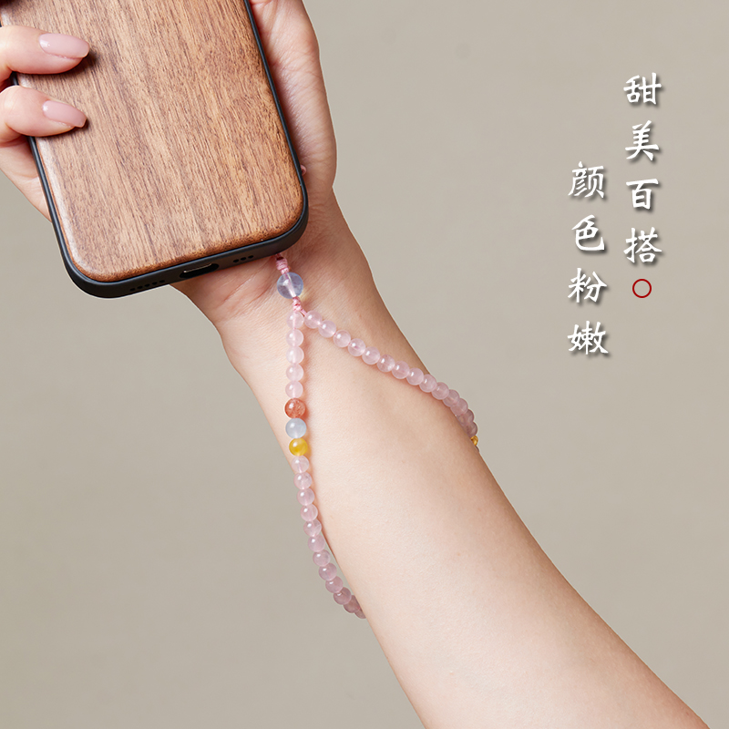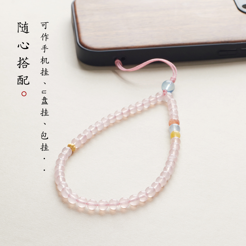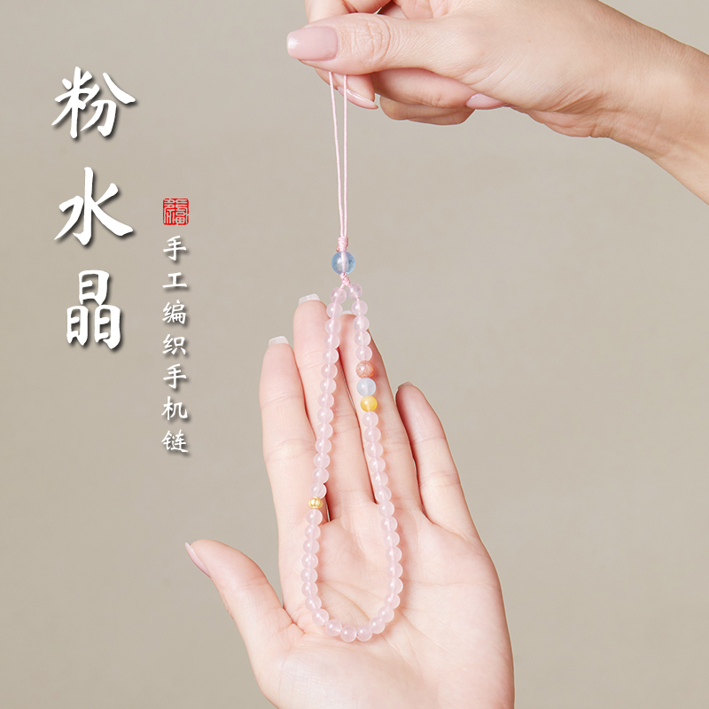原创天然粉水晶手机链女式高端高级感水晶文艺手腕绳防丢手机壳挂绳u盘钥匙扣挂件可爱精致小众甜美粉红色系