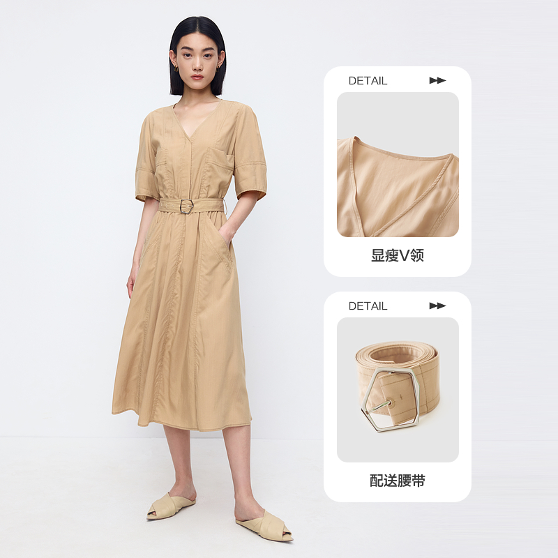 水云间卡其色收腰连衣裙女知识分子风天丝v领中长裙子2025夏新款
