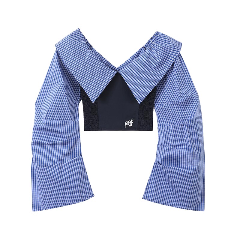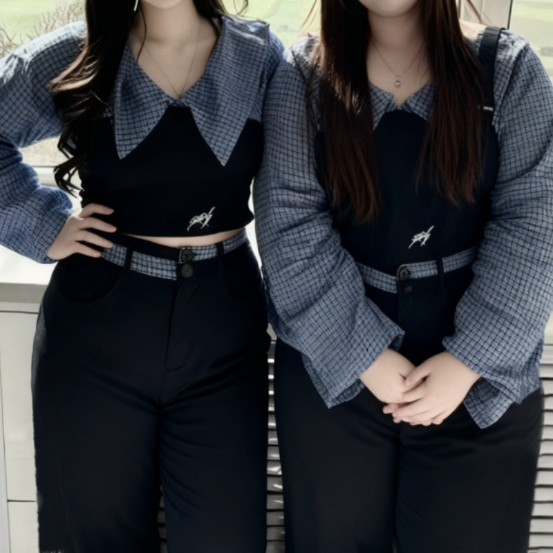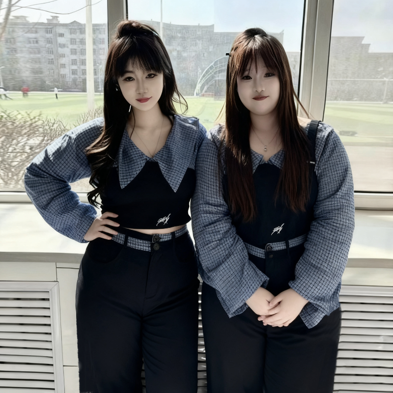 大码胖mm复古高腰阔腿休闲裤设计感撞色拼接短款上衣两件套女春季