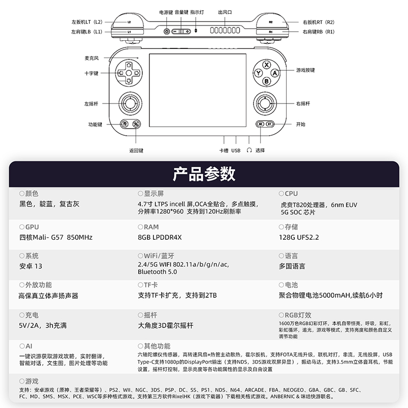 安伯尼克R476H全面屏安卓掌机PSP街机GBA双人DC土星游戏机接电视