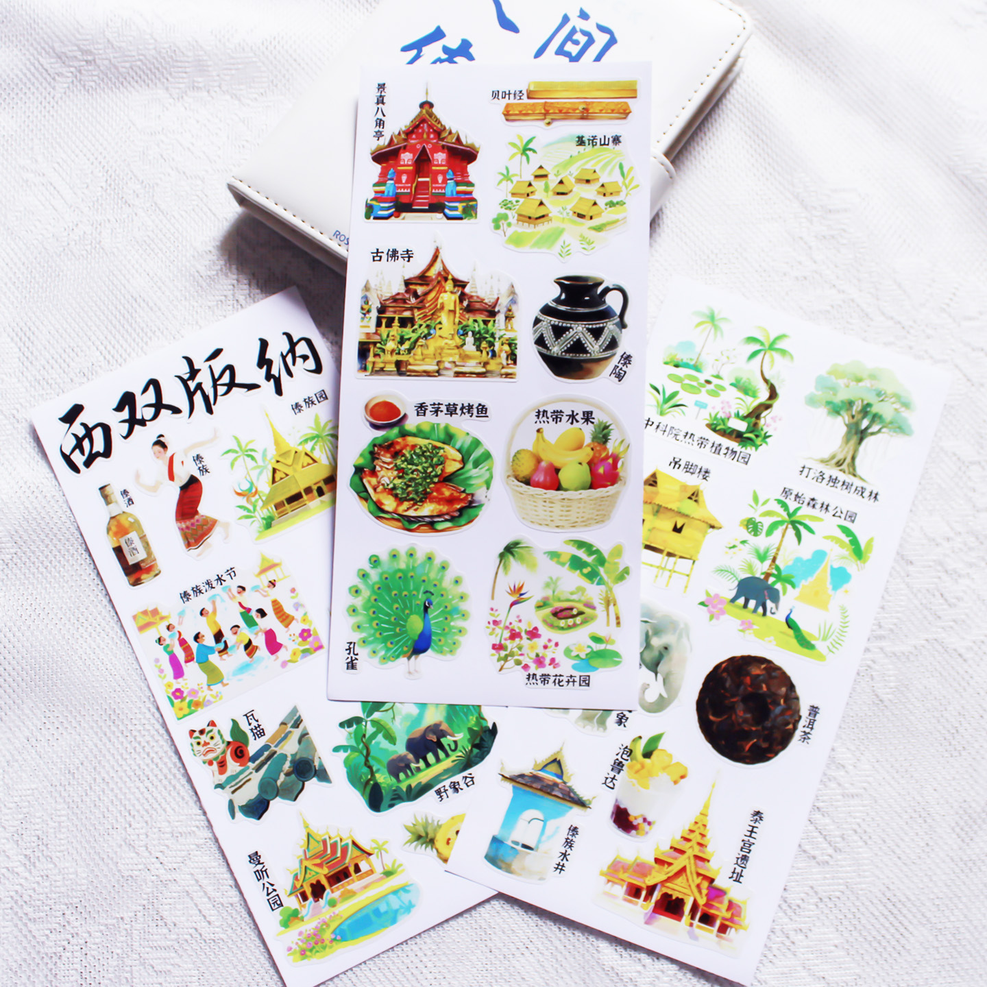西双版纳旅游手帐贴纸美食景点地标家乡人文特产云南手抄报贴画
