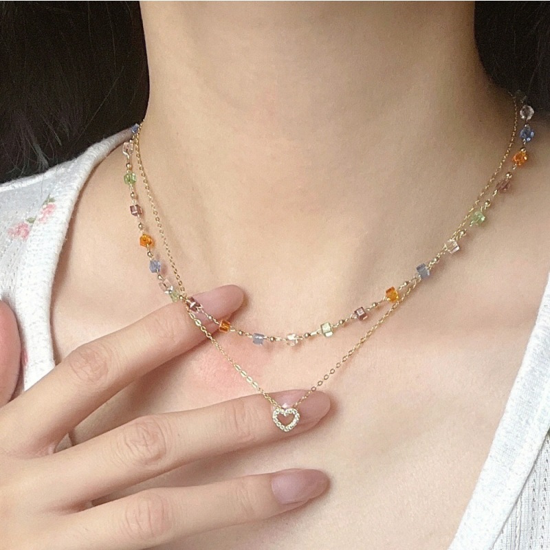 因缺斯汀水晶彩色串珠项链女小众设计小巧爱心叠戴锁骨链简约颈链