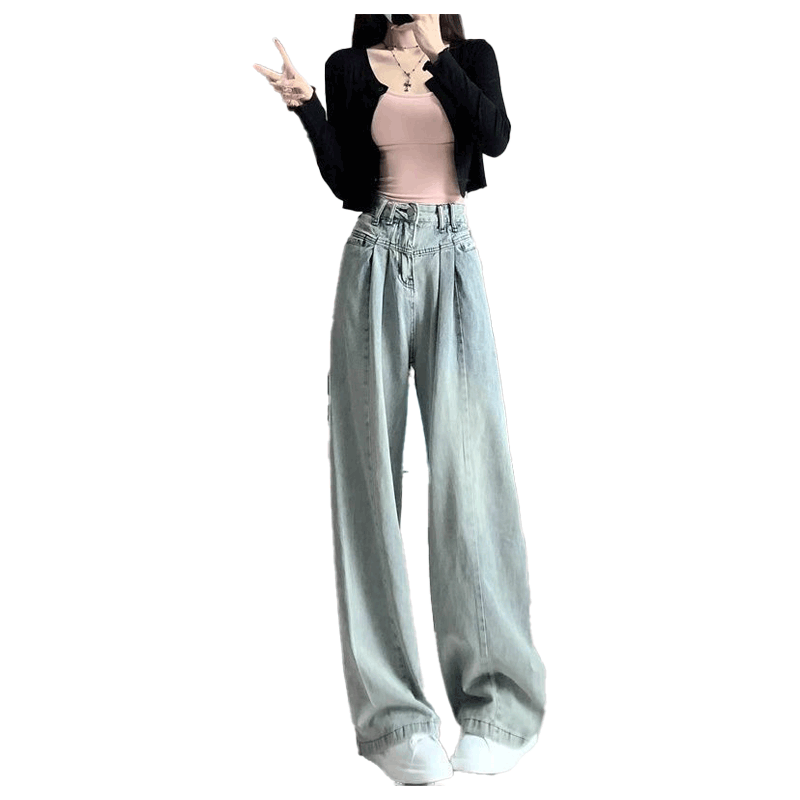 李李杏色原牛腰带阔腿裤牛仔裤女2025秋季新款高腰宽松显瘦拖地裤