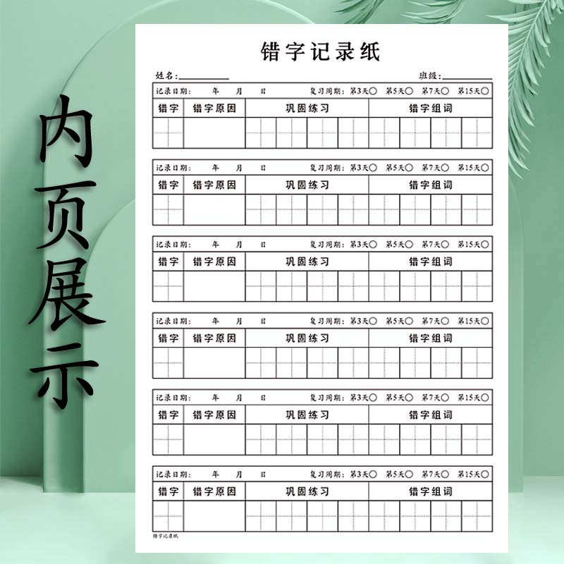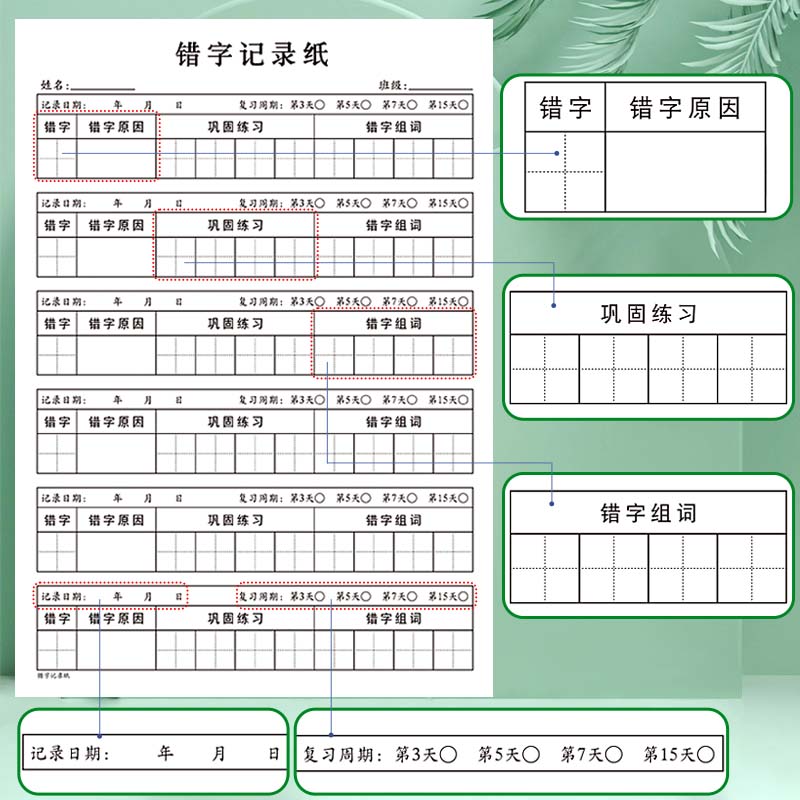 错字记录纸一年级班级儿童小学生错字原因分析巩固练习错字组词写作练习拼音定位默写纸词语归纳专项练字训练