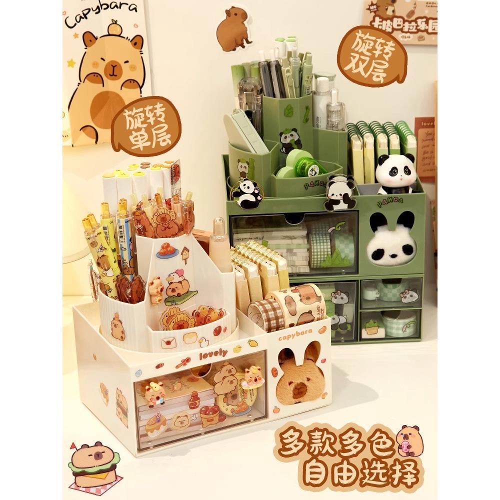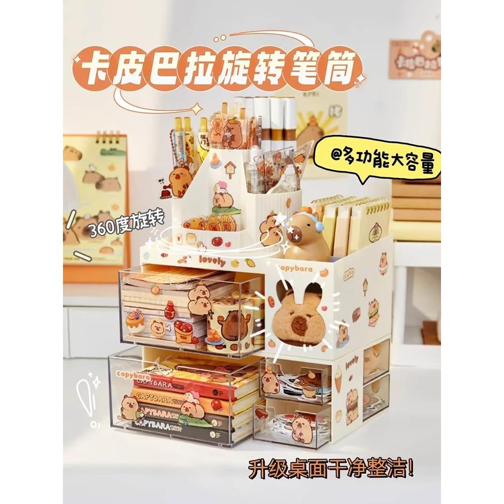 加入豚门!卡皮巴拉旋转笔筒儿童女孩学生书桌桌面抽屉式收纳盒