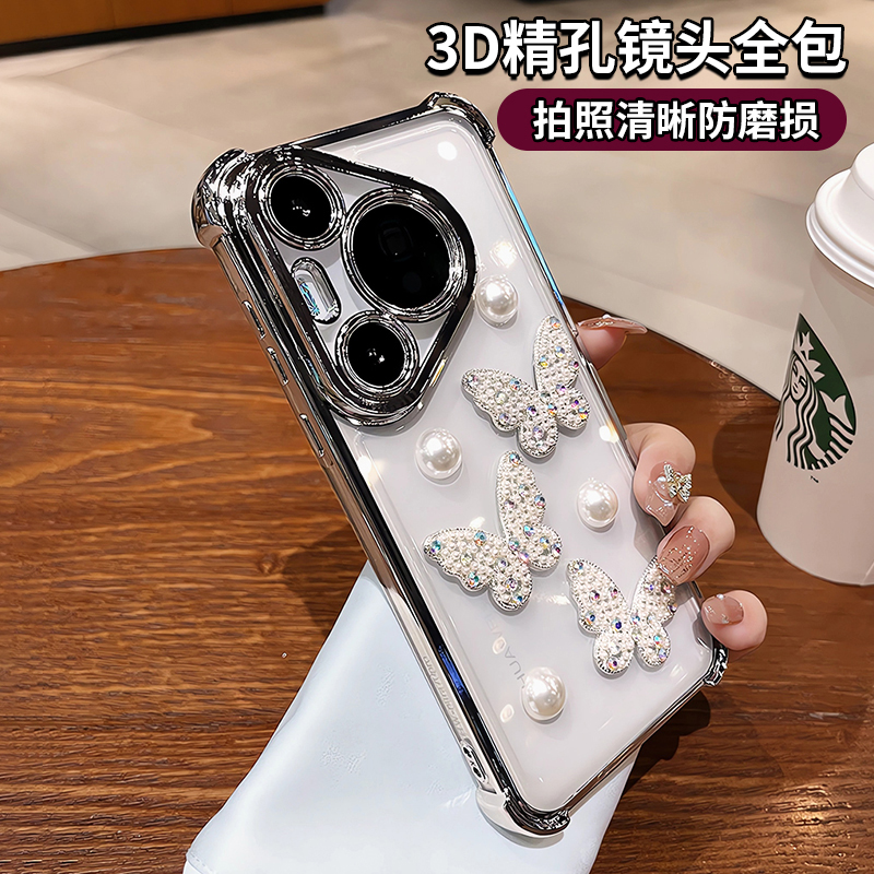 蝴蝶珍珠适用华为pura80手机壳新款透明pura70pro奢华时尚高级感p60镜头全包p50气囊防摔80ultra女p40硅胶套