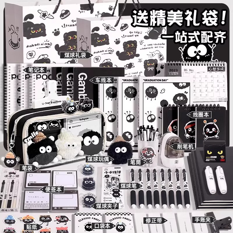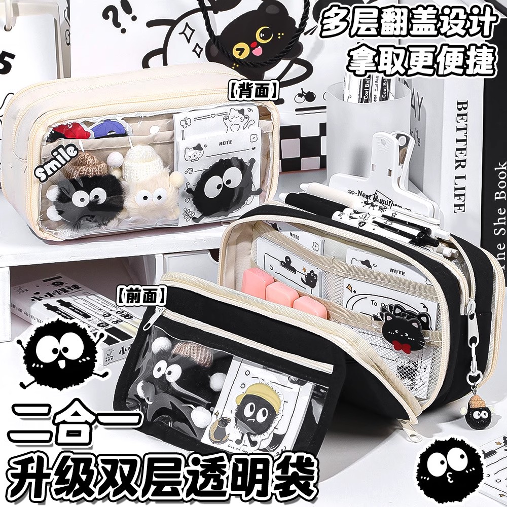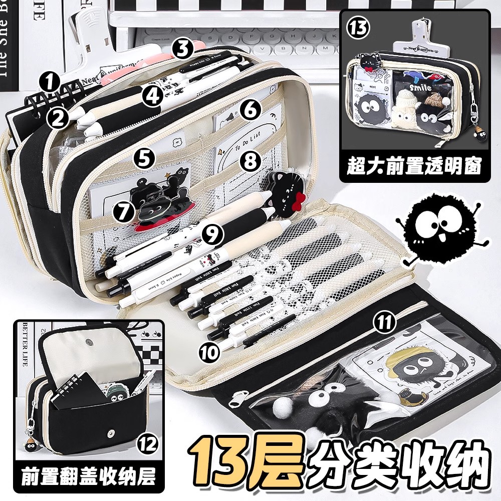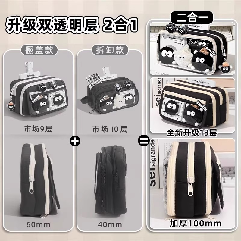 升级13层~小煤球大容量笔袋女生2025新款高颜值ins风文具盒女孩款小学生初中铅笔盒男生透明文具袋男孩款套装