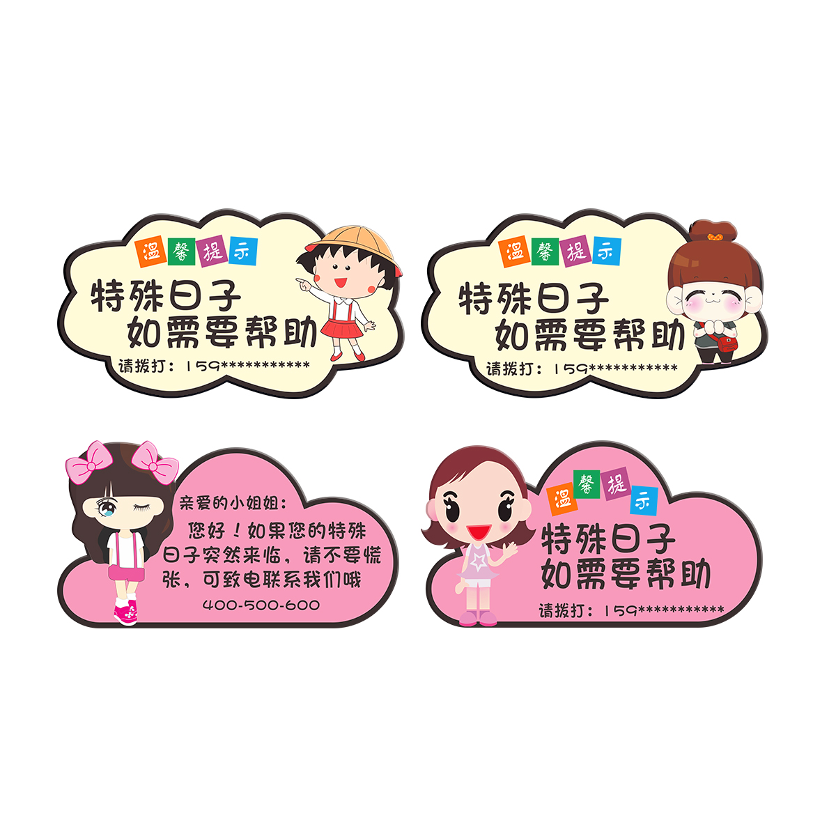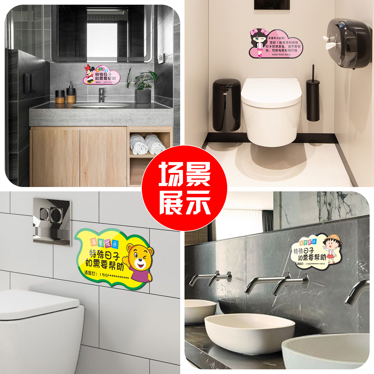 厕所女卫生间温馨提示牌女性生理期特殊日子标语月经大姨妈突然来例假联系电话贴纸酒店客房求助前台服务牌子