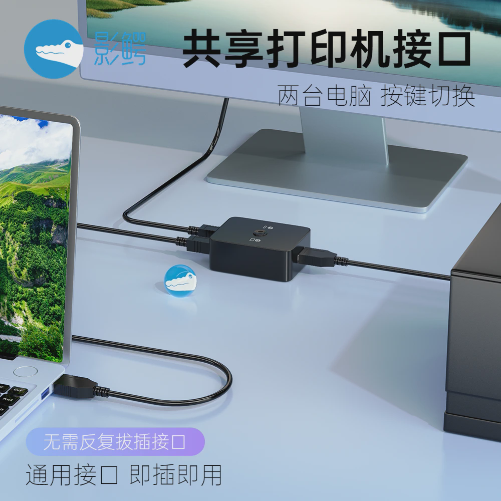 影鳄 USB切换器2进1出共享器方口台式机笔记本电脑打印线连打印机