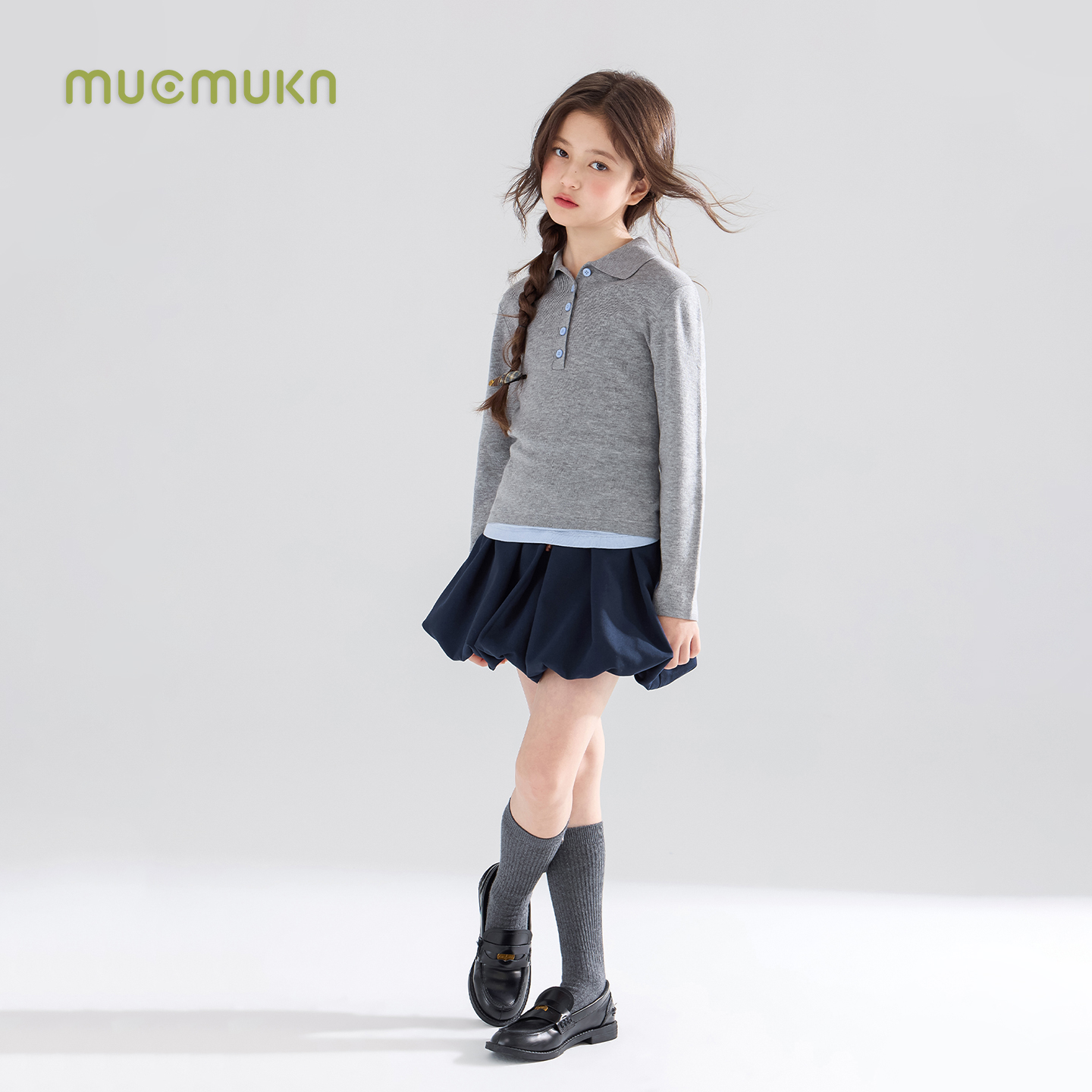 【温柔灰蓝】美利奴羊毛混纺假两件polo领毛衣长袖针织女童秋新款