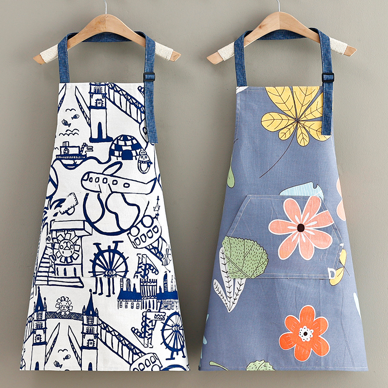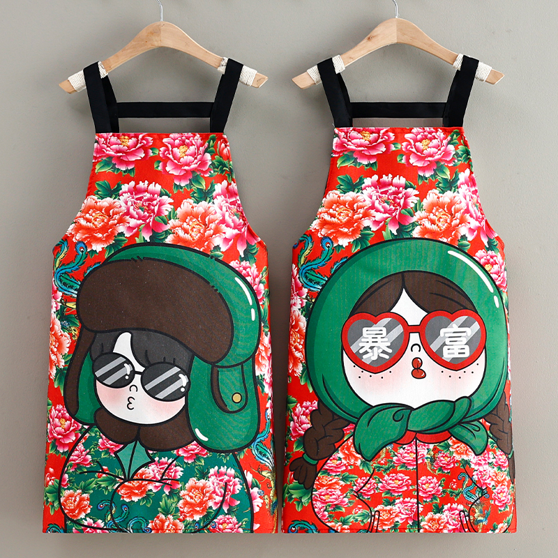 国潮风时尚新款帆布围裙东北大花围腰家用做饭餐饮防油工作服耐脏