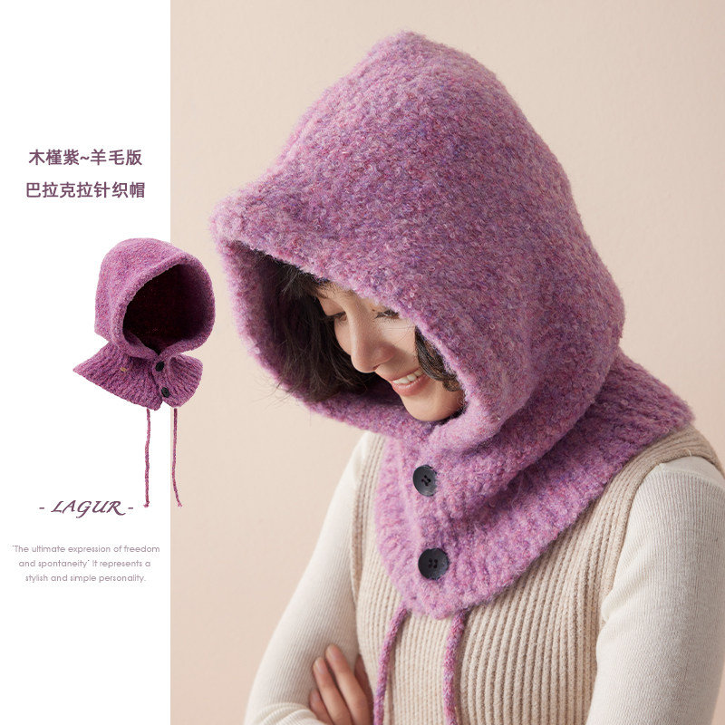 木槿紫~羊毛版!巴拉克拉针织帽围脖一体帽子保暖包头帽女冬百搭