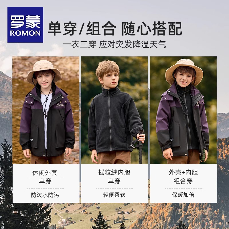 罗蒙儿童冲锋外套三合一可拆卸户外春秋中大童男童保暖防泼水夹克