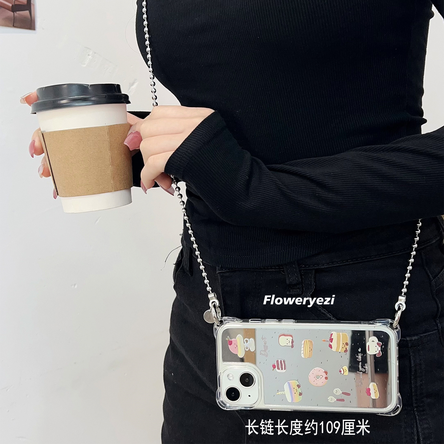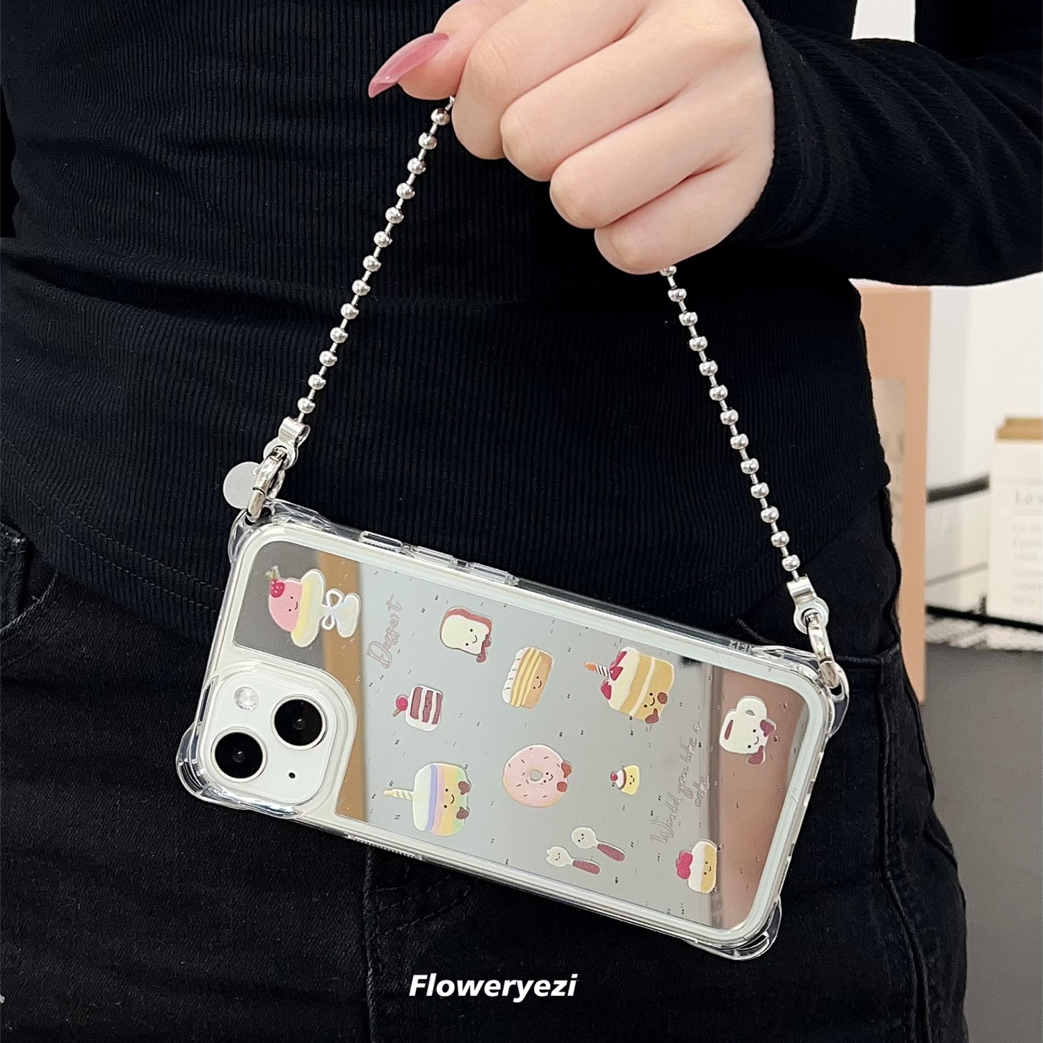 韩系ins风可爱甜品镜面iphone14手机壳链条斜挎可背适用于苹果15promax四角开孔16补妆镜12pro手提挂绳13防摔