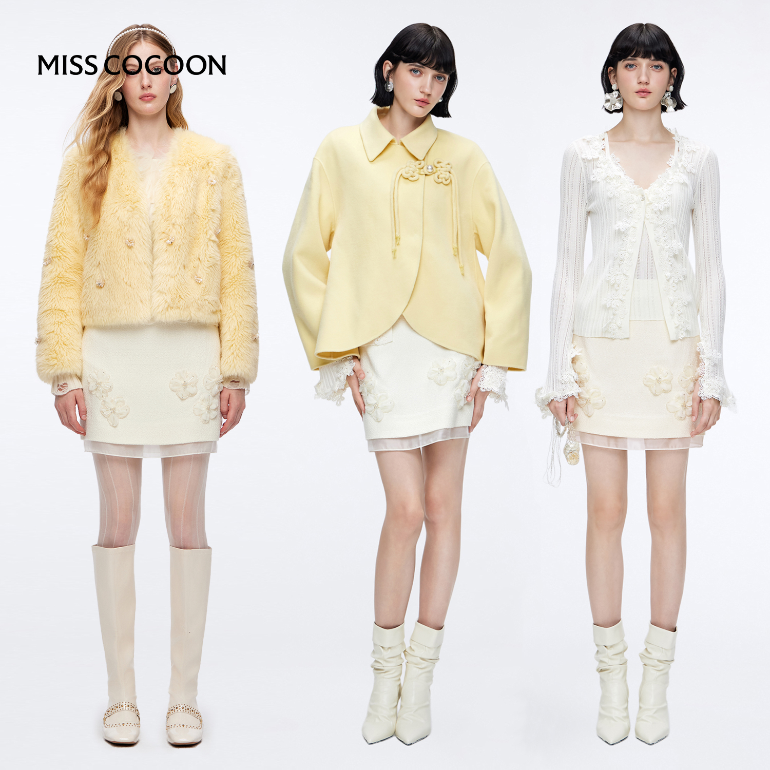 MISSCOCOON可可尼白色短裙女2025秋新款香风花朵小个子一步半身裙