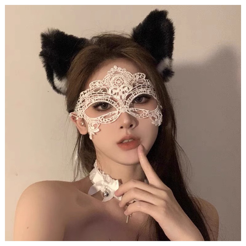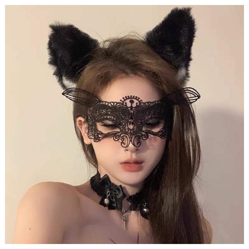 黑色蕾丝性感猫耳朵发箍禁欲系眼罩遮脸网纱万圣节头饰发饰女配饰