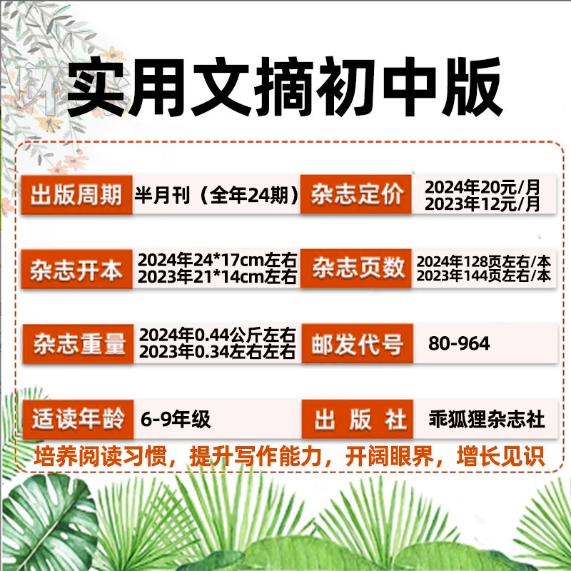 实用文摘中学版初中版杂志2025年/2024年现货订阅全年/半年7-9年级初高中满分作文素材青少年课外阅读教辅学习语文书过刊