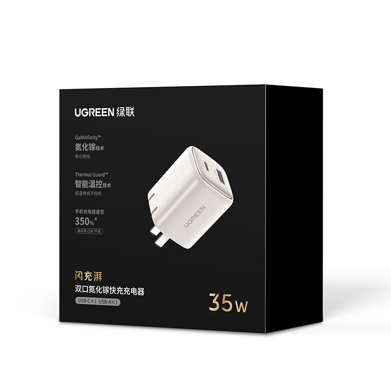 绿联35108氮化镓35W快速充电器USB+type-c二合一CD350白色适用于苹果15系列快充头