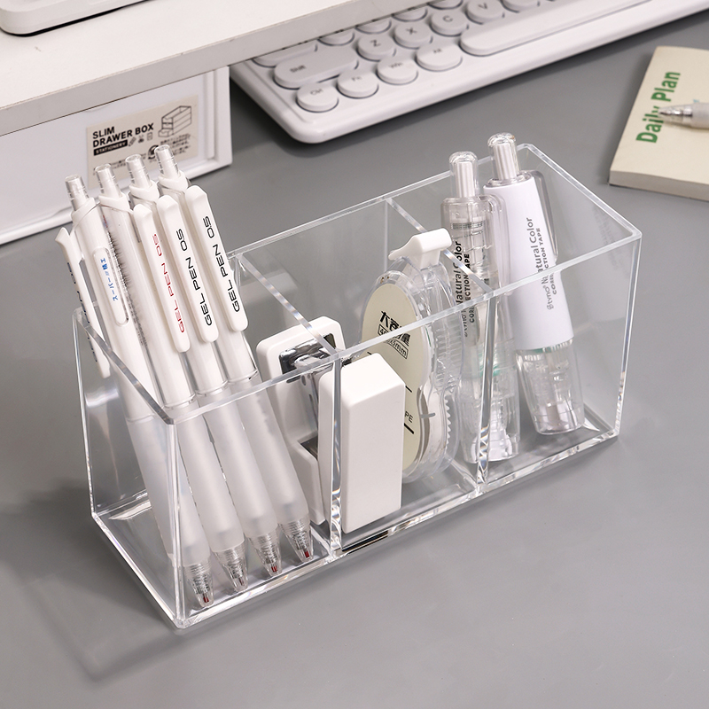 亚克力笔筒文具收纳盒轻奢透明高级感长方形笔桶小学生桌面办公室创意分格置物笔架化妆粉刷眉笔口红收纳筒