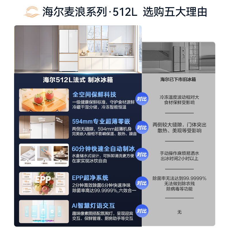 海尔冰箱以旧换新补贴512L麦浪法式双开零嵌入式冰箱家用一级制冰