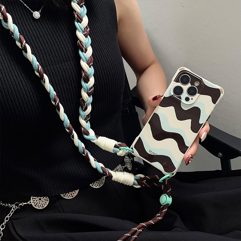 松弛感~原创斜挎可背绿棕波纹手机壳适用于苹果16pro可调节挂绳华为mate70Pro链条小米15ultra背带斜跨magic7