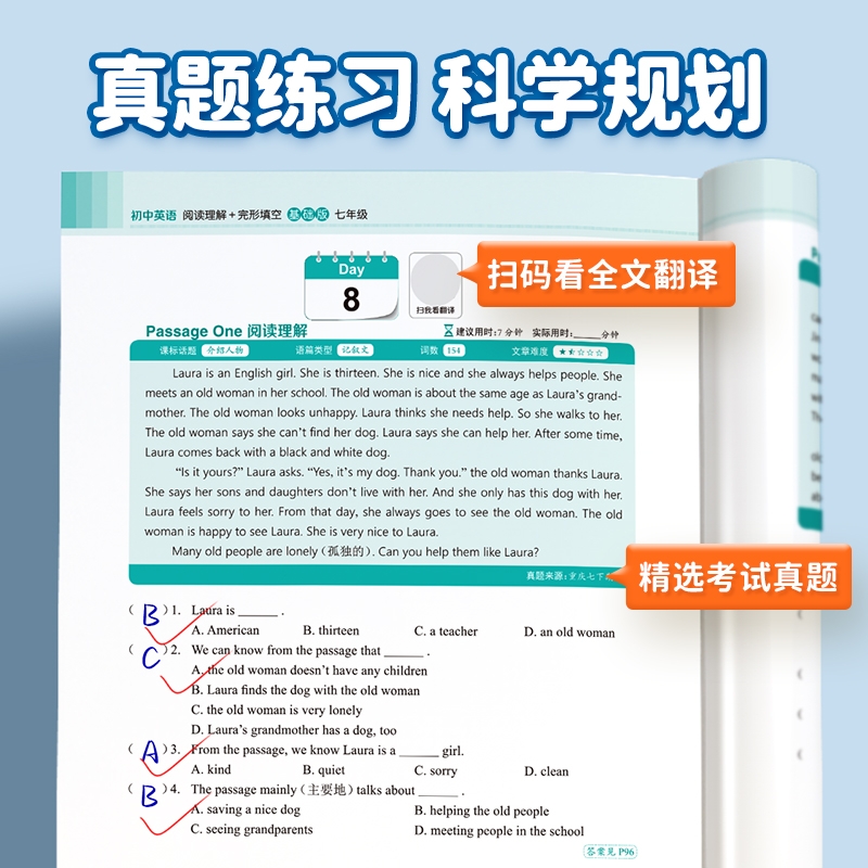 易蓓严选初中英语阅读理解与完形完型填空七八九年级阅读答题技巧中考必刷题短文专项训练初一二三基础提高训练习题册每日课堂解题