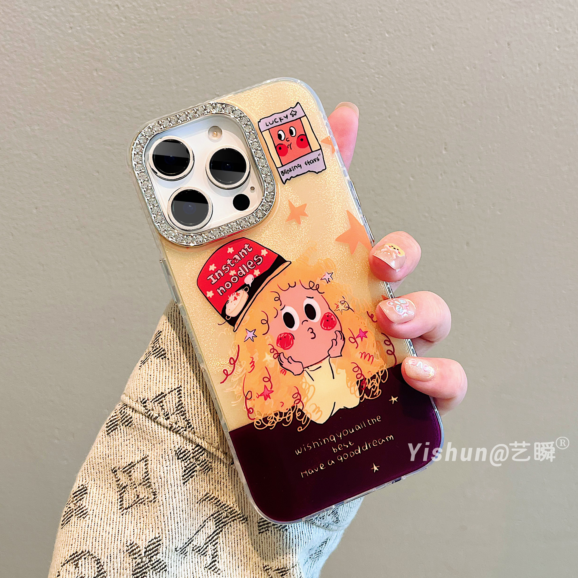 搞怪可爱卷发星星人插画适用16ProMax苹果手机壳iPhone15pro创意新款14pm满钻镜框13卡通plus女款17Pro保护套