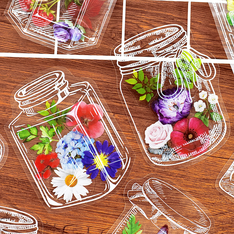 瓶中万物透明贴纸素材包PET防水大贴纸创意玻璃瓶造型花草手工作业干花书签仿真花朵蝴蝶图案咕卡手账装饰DIY
