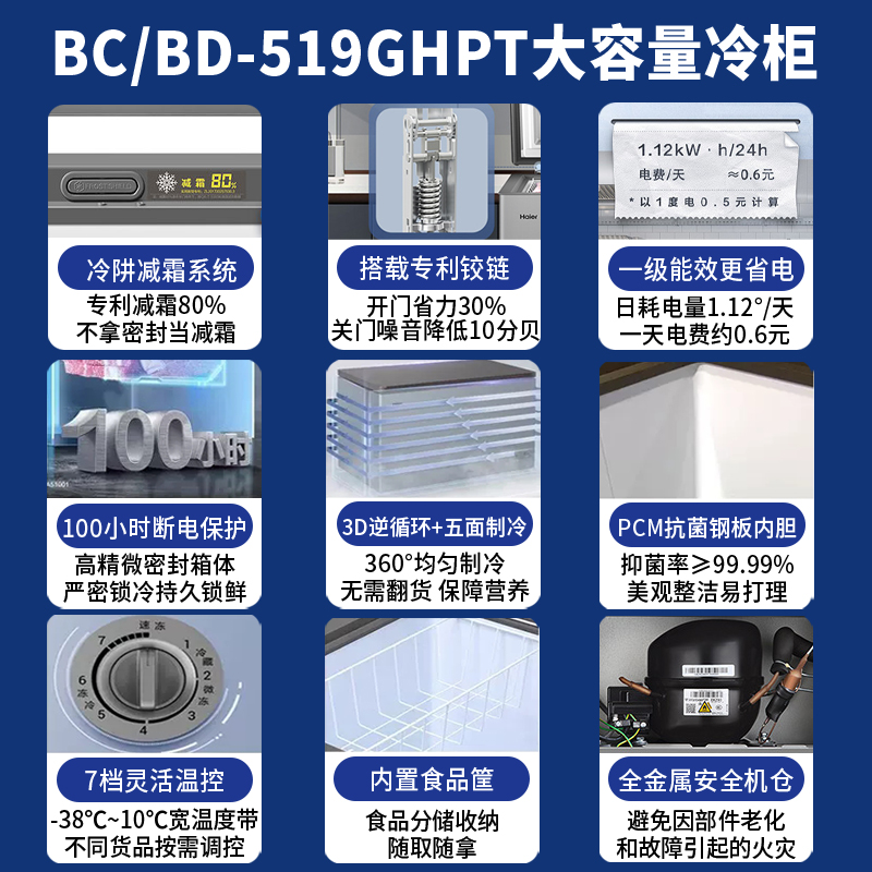 海尔冰柜一级能效300/369/519L家用大容量商用冷柜全冷冻冷藏减霜