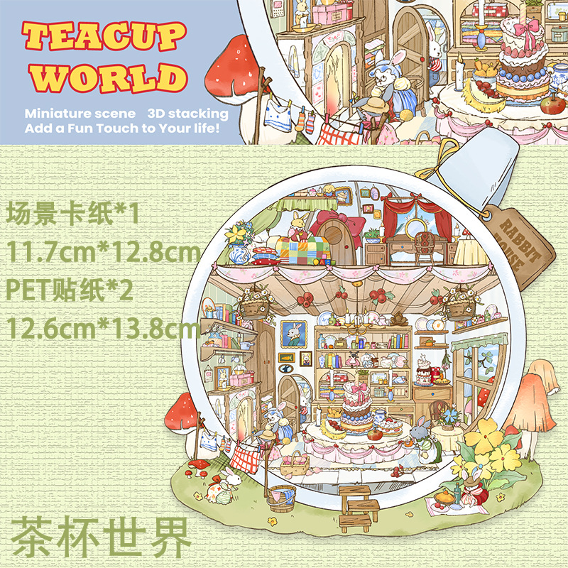 茶杯世界造景贴纸3D微缩小场景可爱立体小屋堆叠手工拼贴解压贴画